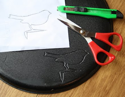 Rita först upp din fågel på ett papper. Försök hålla relativt rena linjer och undvik för mycket detaljer. Inkludera en liten fot som fågeln har landat på. Lägg sedan pappret på frigoliten och fyll i en gång till med en penna. Tryck ganska hårt. Silhuetten överförs till frigoliten, som nu kan klippas och/eller skäras ut. När figuren är färdigklippt är det dags att jämna till kanterna. Värm en bordskniv över en ljuslåga. Tryck på kanterna som nu smälter lite grann och blir jämnare.